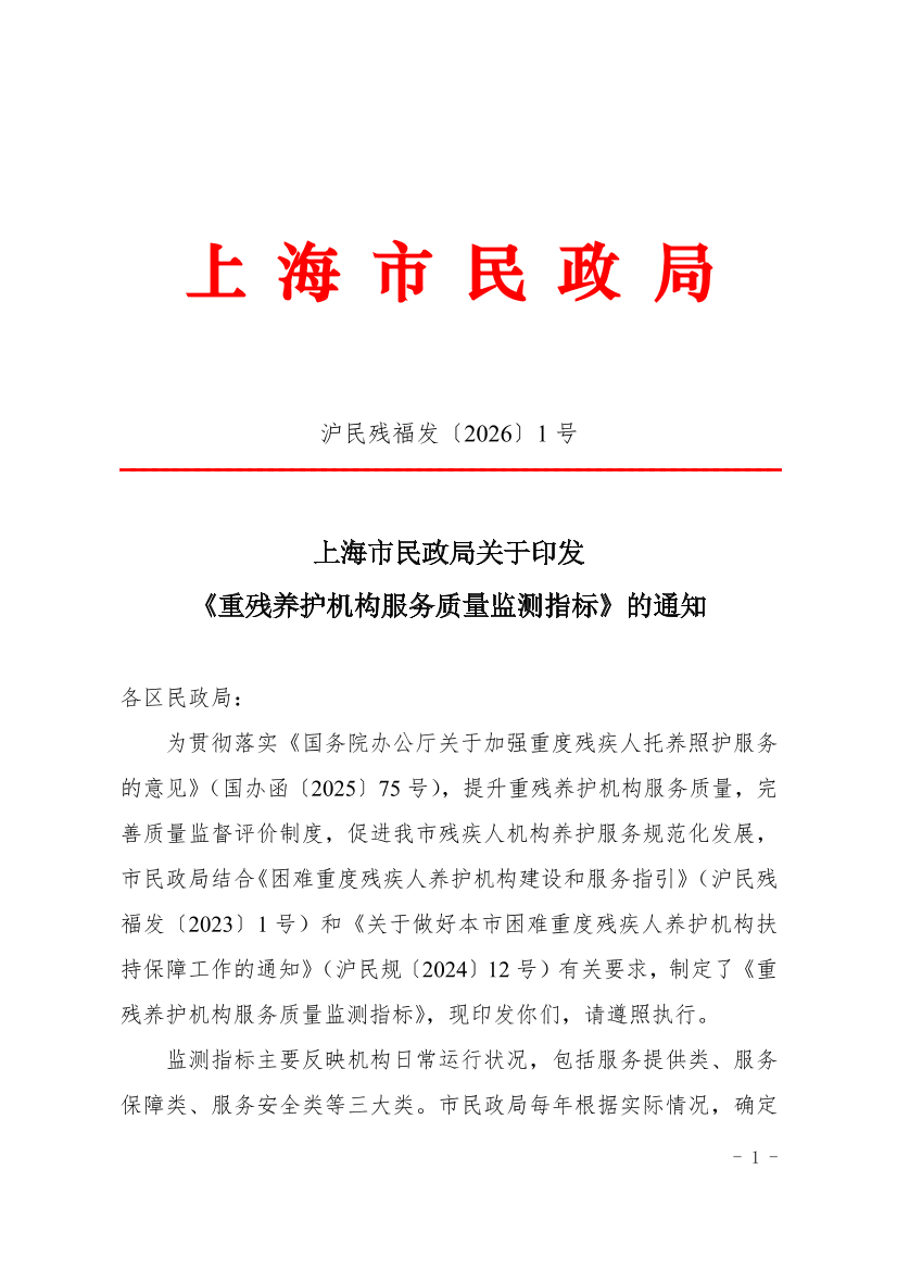 上海市民政局关于印发《重残养护机构服务质量监测指标》的通知 ( 2026-01-20 )