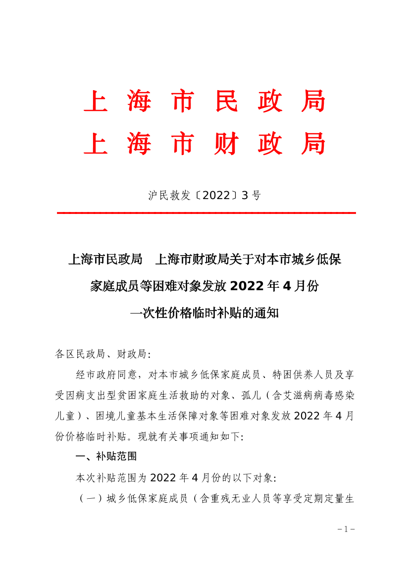 上海市民政局 上海市财政局关于对本市城乡低保家庭成员等困难对象发放2022年4月份一次性价格临时补贴的通知 ( 2022-06-09 )