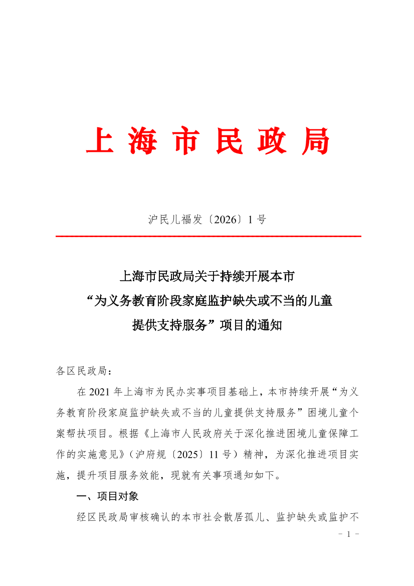 上海市民政局关于持续开展本市“为义务教育阶段家庭监护缺失或不当的儿童提供支持服务”项目的通知 ( 2026-03-10 )