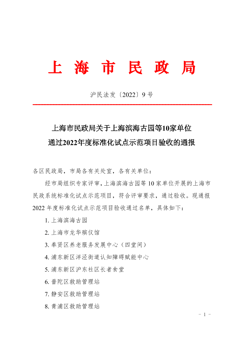 上海市民政局关于上海滨海古园等10家单位通过2022年度标准化试点示范项目验收的通报 ( 2022-12-22 )
