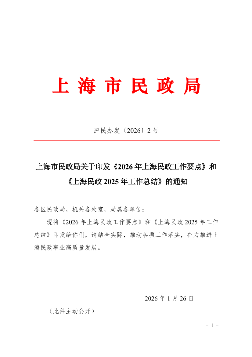 现将《2026年上海民政工作要点》和《上海民政2025年工作总结》印发给你们,请结合实际,推动各项工作落实,奋力推进上海民政事业高质量发展。